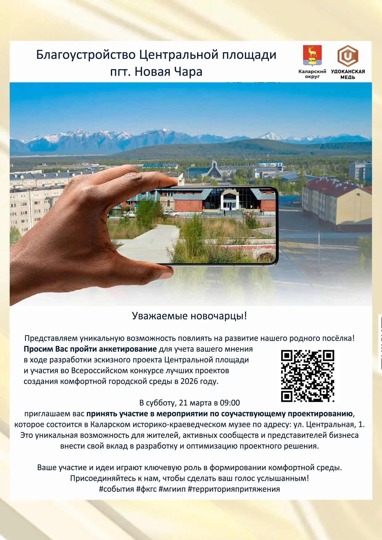 16.03.2026 Уважаемые новочарцы! На минувшей неделе в ходе общественных обсуждений Вы определили Центральную площадь пгт. Новая Чара территорией, на которой будет реализован проект создания комфортной городской среды.Администрация Каларского муниципального округа Забайкальского края совместно с ООО «Удоканская медь» объявляет о старте приёма от граждан предложений и обсуждения предлагаемых мероприятий и функций Центральной площади и прилегающей к ней территории